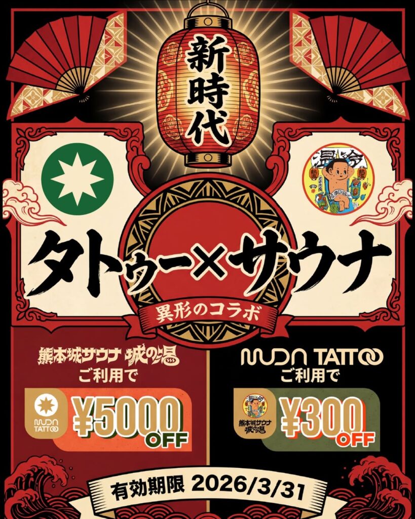 熊本城サウナ 城の湯とMUDA TATTOOのコラボ企画で皆様に割引券をお届けいたします。