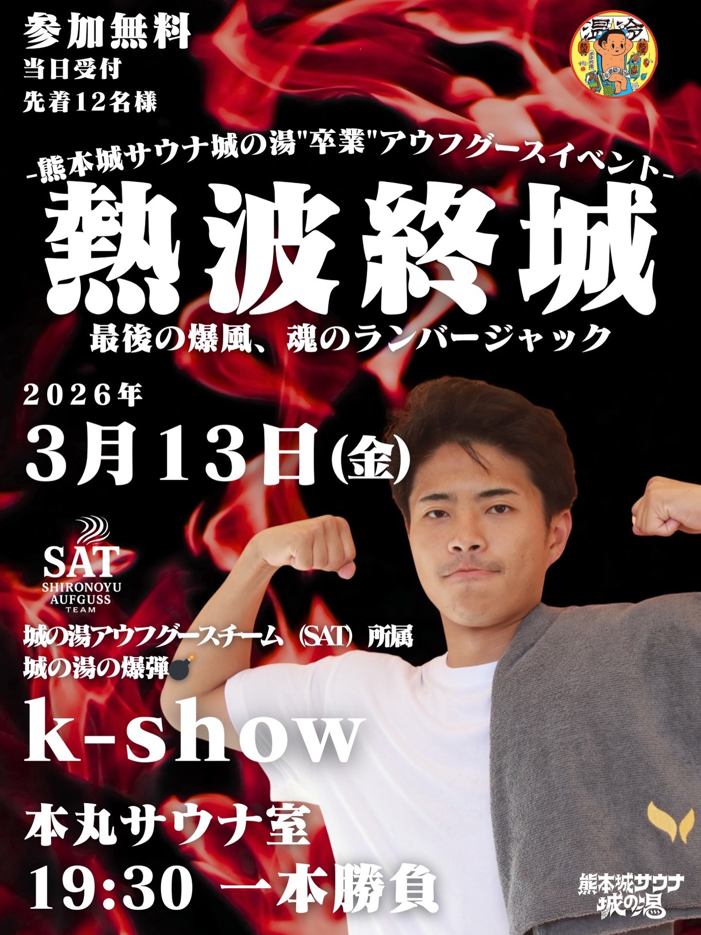 SAT(城の湯アウフグースチーム)のk-showが、就職に伴い、城の湯を卒業します…🌸